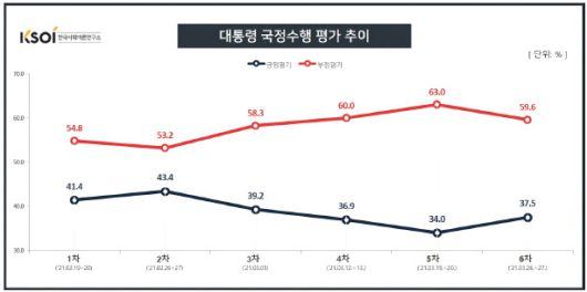 부정평가는 전주 대비 3.4%포인트 하락한 59.6%였따. 긍·부정 간 격차(22.1%포인트)는 전주 대비 7%포인트 가량 줄었다.