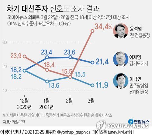 리얼미터가 오마이뉴스 의뢰로 지난 22∼26일 전국 18세 이상 2천547명에게 여야 대권주자 14명의 선호도를 조사한 결과, 응답자의 34.4%가 윤 전 총장을 꼽았다.