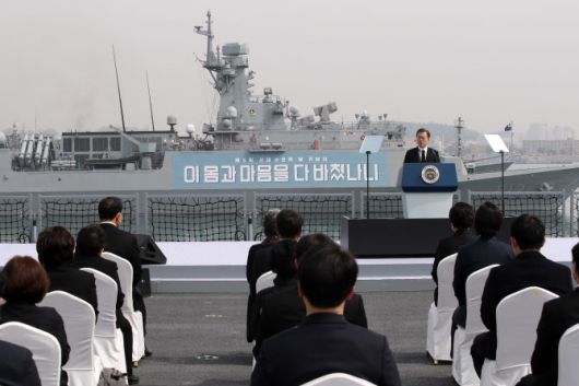 문재인 대통령이 26일 오후 경기도 평택시 해군 2함대사령부 천자봉함·노적봉함에서 열린 제6회 서해수호의 날 기념식에서 기념사를 하고 있다. (사진=연합뉴스) |