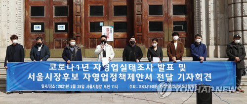 코로나19자영업자비상대책위원회는 29일 서울도서관 앞에서 기자회견을 열고 코로나19가 1년간 자영업자들에게 끼친 영향에 관한 실태조사 결과를 발표했다. 전국가맹점주협의회 주관으로 치러진 이번 조사는 지난 2월 5일부터 3월 25일까지 전국자영업자들을 모바일 설문조사하는 방식으로 진행됐다.