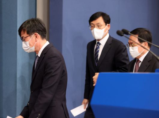 김상조 전임 청와대 정책실장(왼쪽)이 29일 청와대 춘추관에서 유영민 비서실장, 이호승 신임 정책실장(가운데)과 브리핑을 마치고 브리핑장을 나서고 있다. 연합뉴스 |