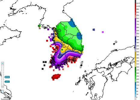 29일 전국 대부분에서 황사경보가 발효됐다. 서해와 제주, 남해를 중심으로 미세먼지 농도가 1000㎍/㎥을 넘어서면서 적색으로 표시되고 있다. (출처:기상청) |