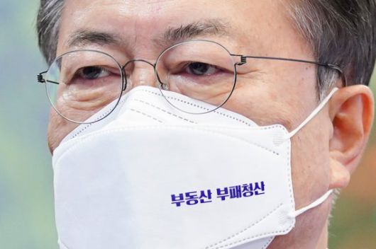 (서울=뉴스1) 유승관 기자 = 29일 청와대 본관에서 열린 제7차 공정사회 반부패정책협의회에 참석한 문재인 대통령의 마스크에 '부동산 부패청산'이 쓰여져 있다. 2021.3.29/뉴스1 /사진=뉴스1화상 |