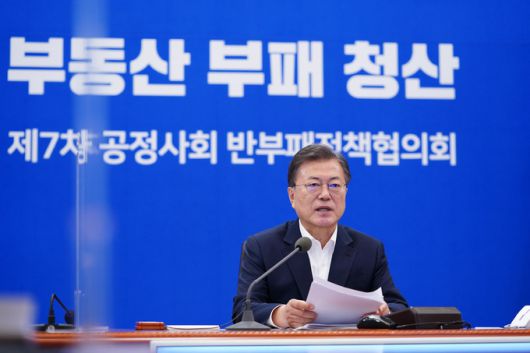 문재인 대통령은 29일 “공직자와 기획부동산 등의 투기 행태에 대해 소속과 지위 고하를 막론하고 있는 그대로 드러내고 엄정하게 처리하라”고 지시했다. 문 대통령은 이날 청와대에서 주재한 공정사회 반부패정책협의회에서 “멈추지 말고, 정치적 유·불리도 따지지 말고 끝까지 파헤치라”면서 “이를 위해 국가의 행정력과 수사력을 총동원해주기를 바란다”고 말했다. 문 대통령은 “우리 사회의 부동산 부패 청산이 지금 이 시기 반부패 정책의 최우선 과제임을 천명한다”며 “야단맞을 것은 맞으면서 국민의 분노를 부동산 부패의 근본적인 청산을 위한 동력으로 삼아주기를 바란다”고 말했다. 문 대통령은 국회를 향해서도 “이번 기회에 공직자 이해충돌방지법을 반드시 제정해 공직자 부패의 싹을 원천적으로 차단해야 한다”며 협조를 당부했다. 이어 “부동산 불공정거래 행위와 시장교란 행위를 금지하고, 상설적 감시기구로 부동산거래분석원을 설치하겠다”며 투명·공정한 부동산 거래질서 확립을 위한 복안도 밝혔다.