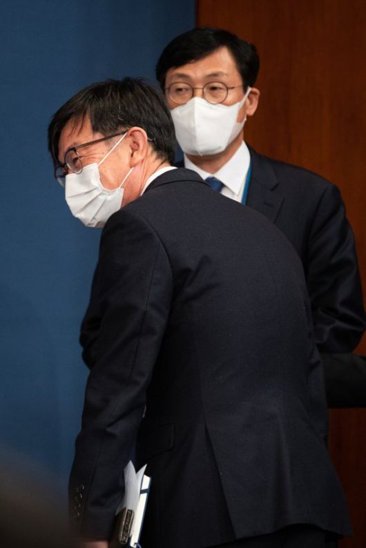 김상조 청와대 정책실장(앞쪽)이 29일 청와대 춘추관에서 퇴임 인사를 마치고 브리핑룸을 나서고 있다. 뒤에는 신임 이호승 정책실장. 문재인 대통령은 이날 청와대 정책실장을 이호승 경제수석으로 교체했다. 뉴스1 |