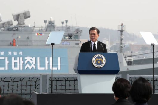 문재인 대통령이 26일 오후 경기도 평택시 해군 2함대사령부 천자봉함·노적봉함에서 열린 ‘제6회 서해수호의 날’ 기념식에서 기념사를 하고 있다. [연합] |
