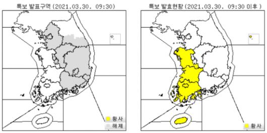 현재 충남과 전라권, 제주도, 울릉도, 독도에서는 황사경보가 유지되고 있다.