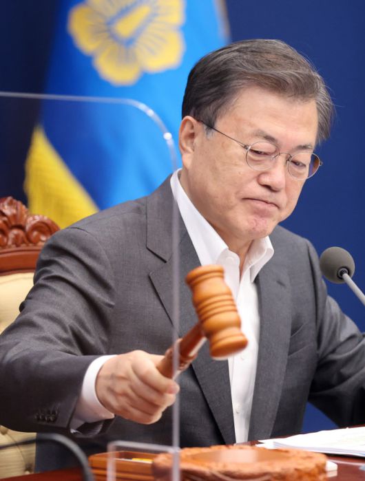 문재인 대통령이 30일 오전 청와대에서 열린 제14회 국무회의에서 의사봉을 두드리고 있다.(사진=연합뉴스) |