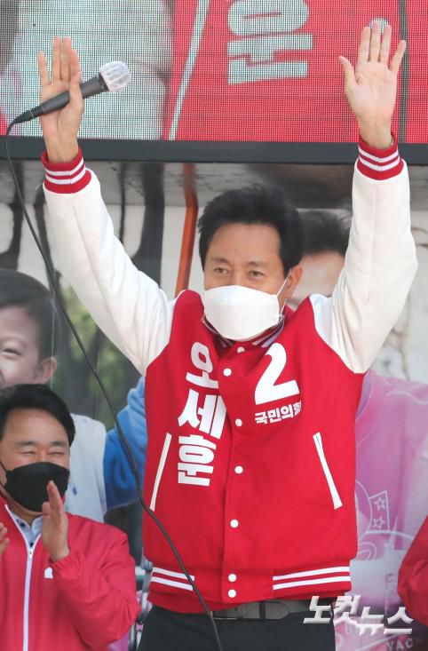 오세훈 국민의힘 서울시장 후보가 30일 오후 서울 영등포역 광장에서 열린 집중유세에서 지지를 호소하고 있다.