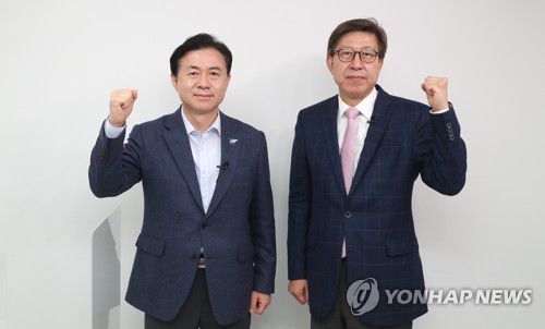 3월 29일 부산 동구 부산일보에서 열린 4·7 부산시장 보궐선거 후보자 토론회에서 더불어민주당 김영춘 후보(왼쪽)와 국민의힘 박형준 후보가 인사하는 모습 [부산일보 제공. 재판매 및 DB 금지] |