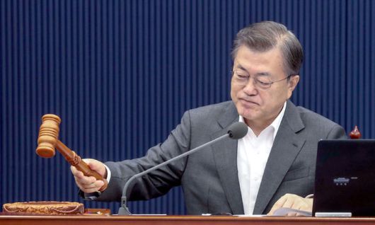 문재인 대통령이 30일 청와대에서 열린 국무회의에서 의사봉을 두드리고 있다. 청와대사진기자단 |