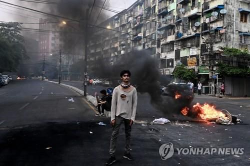 양곤 시내에서 한 시위 참여자가 불타는 바리케이드 옆에 서있다. 2021.3.30 |