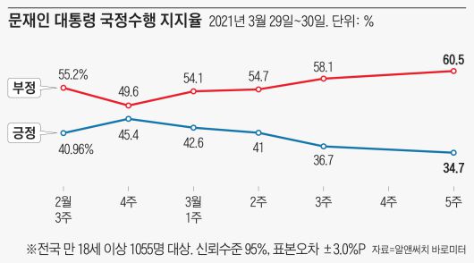데일리안이 여론조사 전문업체 알앤써치에 의뢰해 지난 29~30일 성인남녀 1055명을 대상으로 실시한 3월 다섯째 주 정례조사에 따르면, 문 대통령 국정수행에 대한 긍정평가는 직전 조사(3월 셋째주)보다 2.0%p 하락한 34.7%로 나타났다.