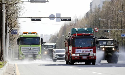 광주 지역에 미세먼지 비상저감조치가 시행된 지난 30일 광주 북구와 31사단, 북부소방서가 합동으로 살수차를 이용해 물을 뿌리고 있다. 광주북구 제공 |