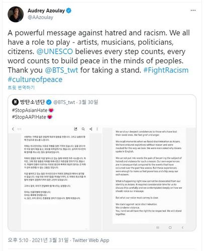 오드레 아줄레 유네스코(UNESCO) 사무총장은 31일(현지시간) 그룹 방탄소년단(BTS)이 인종차별을 비판하며 트위터 공식 계정에 한국어와 영어로 올린 글을 공유하며 이같이 적었다.