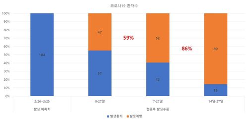 일반적으로 백신 접종 후 항체가 형성되는 데 2주가량이 걸린다는 점을 고려하면, 1차 접종만으로도 접종군의 발생률이 대폭 감소한 것이다.