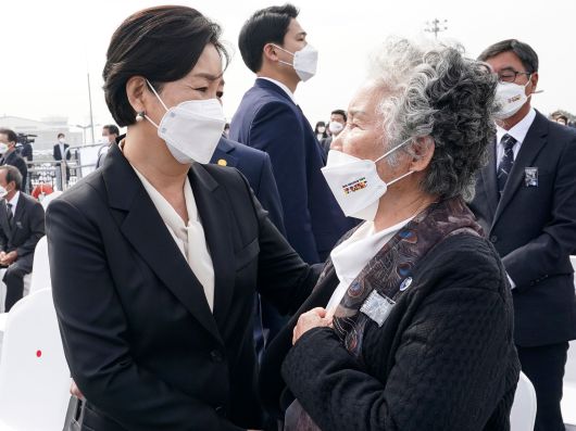 문재인 대통령 부인 김정숙 여사가 26일 오후 경기도 평택시 해군 2함대사령부 천자봉함·노적봉함에서 열린 제6회 서해수호의 날 기념식을 마친 뒤 '천안함 46용사'의 한 명인 고(故) 민평기 상사의 모친 윤청자 여사를 위로하고 있다. /연합뉴스 |