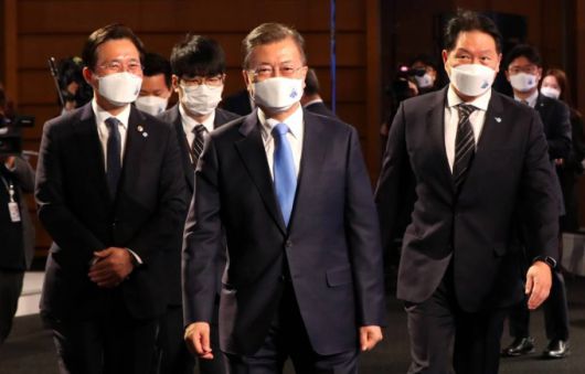 문 대통령은 특히 "경제부처, 정책실장, 비서실장 모두 기업인들하고 활발하게 만나서 대화하는게 좋다고 생각한다"고 강조했다.