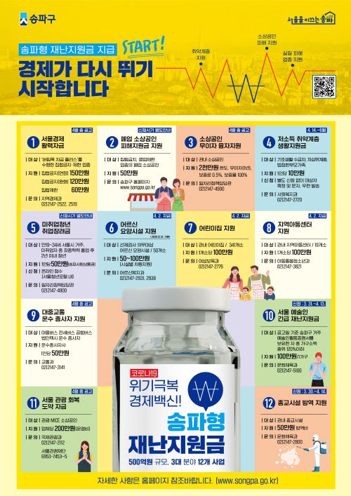 아시아투데이 김인희 기자 = 서울 송파구가 코로나19로 인한 민생위기를 해결하고자 코로나 피해계층 5만9천명에게 500억원 규모(소상공인 무이자 융자금 포함)의 ‘송파형 재난지원금’을 지급한다고 1일 밝혔다.