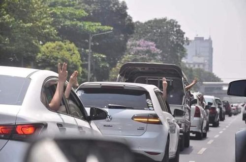 또 다른 동영상을 보면 길에 늘어선 차량이 일제히 경적을 울리고, 탑승자들이 창밖으로 손을 내밀어 저항의 상징인'세 손가락 경례'를 하고 있다.