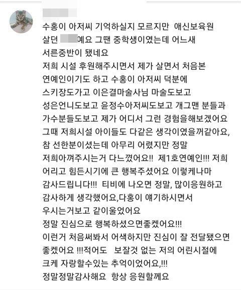 박수홍의 사기 사건이 세간에 밝혀지면서 박수홍의 유튜브 채널에는 박수홍에 대한 응원과 미담이 쏟아지고 있다. 앞서 애신원에서 생활했다는 한 네티즌은 지난 31일 유튜브에 “저희 시설 후원해주시면서 수홍이 아저씨 덕분에 스키장도 가고 이은결 마술사님 마술도 보고 개그맨분과 가수들도 봤다”면서 “저희가 어리고 힘든 시기에 큰 행복을 주셨다. 이렇게나마 감사드린다”고 고마운 마음을 전해 훈훈함을 자아냈다.