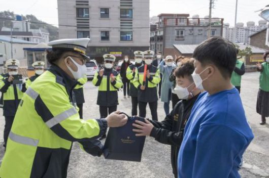 협약식과 함께 중마초등학교 학생들이 “저희를 안전하게 지켜줘서 감사합니다”라며 감사의 마음을 담은 손편지를 전달해 감동을 더했다. 편지는 봉사단체들을 대표해 조성태 단장에게 전달됐다.