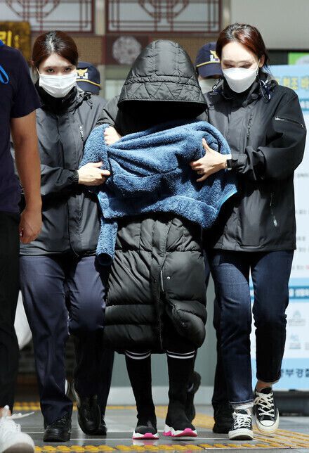 인천 을왕리해수욕장 인근에서 치킨 배달을 하던 50대 가장을 치어 숨지게 한 음주 운전자(가운데)가 지난해 9월14일 오후 구속 전 피의자 심문(영장실질심사)을 받기 위해 인천시 중부경찰서를 나오고 있다. 연합뉴스 |