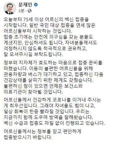 문 대통령은 "정부와 지자체가 효도하는 마음으로 접종 준비를 마쳤다"며 "이동이 불편한 어르신들을 위해 관용 차량과 버스가 대기하고 있고, 접종하신 다음 건강상태를 살피기 위한 체계도 갖췄다"고 소개했다.