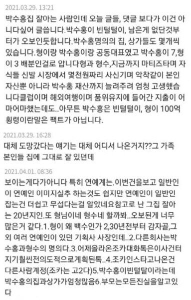 한 누리꾼은 박수홍 관련 기사에 댓글을 통해 “박수홍이 빈털터리, 남은 게 없단 것부터 오보인 듯하다. 박수홍 명의의 집, 상가들도 몇 개씩 있다. 형이랑 박수홍이랑 공동 대표였고 박수홍이 7, 형이 3 배분인 걸로 안다”고 주장했다.