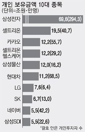 박종진 한국예탁결제원 주식·파생등록 부장은 "개인 매수세가 우량 대기업 외에도 신성장 부문에서 늘어난 결과"라면서 "보유금액 기준으로 배터리·인터넷 종목 증가세가 두드러진다"고 분석했다. 1일 예탁결제원에 따르면 지난해 개인투자자들의 주식 보유금액 중 상위 10대 종목은 162조원으로 집계됐다. 2019년(81조1000억원) 대비 99.9% 증가해 두 배로 늘어난 셈이다. '배터리주' 삼성SDI 보유금액이 2019년 대비 199.8% 급증했고 카카오(192.8%)와 네이버(187.3%) 순으로 눈에 띄는 증가세를 보였다. 종목별로 보면 개인 보유금액은 삼성전자(69조6000억원), 셀트리온(19조5000억원), 카카오(12조2000억원), 셀트리온헬스케어(12조2000억원), 삼성물산(12조원) 순이었다.