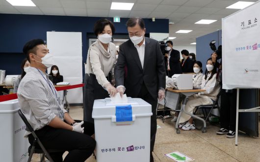 [헤럴드경제=박병국 기자]문재인 대통령과 부인 김정숙 여사가 2일 오전 2021 4·7 재·보궐선거 사전 투표를 완료했다.