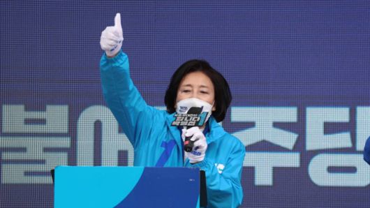 박영선 더불어민주당 서울시장 후보가 2일 서울 중구 남대문시장 앞에서 지지를 호소하는 유세 연설을 하고 있다./사진=뉴시스 |