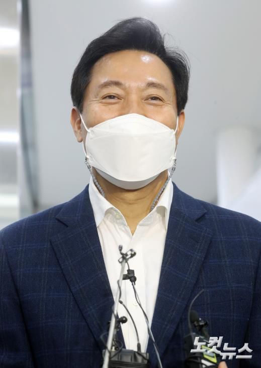 오세훈 국민의힘 서울시장 후보가 4·7 재·보궐선거 사전투표 둘째날인 3일 오전 서울 광진구 자양제3동주민센터에 마련된 사전투표소에서 투표를 마치고 취재진 질문에 답하고 있다.