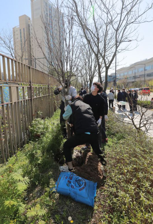 식목일인 5일 오전 정부세종청사 온실 인근에서 공무원과 입주 기관 직원들이 나무를 심고 있다.(사진=연합뉴스) |