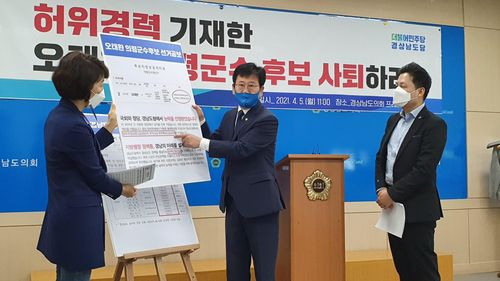 (창원=연합뉴스) 황봉규 기자 = 4·7 재보선 의령군수 재선거에 출마한 국민의힘 오태완 후보의 허위경력 의혹과 관련해 경남도선거관리위원회가 '오 후보 경력이 일부 사실이 아니다'고 결정하자 더불어민주당 경남도당이 5일 오 후보의 사퇴를 촉구했다.