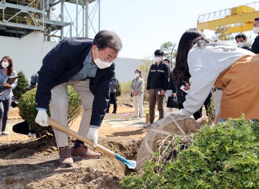 문재인 대통령은 5일 제76회 식목일을 맞아 세계 최초의 복합 액화천연가스(LNG) 발전소로 변모한 당인리발전소의 지상공원에 나무를 심고 탄소 흡수, 미세먼지 저감 등을 위한 도시숲 조성의 필요성을 강조했다.