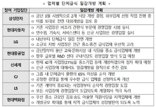 LG는 전면개방 원칙하에 그룹 내 단체급식 일감을 순차적으로 개방하고, CJ는 65% 이상을 개방할 예정이다. 참여 기업집단들은 먼저 기숙사·연구소 등 소규모 시설을 대상으로 내년에 약 1000만식 규모로 일감을 개방하고, 향후 대규모 사업장으로 개방 범위를 순차적으로 확대한다.