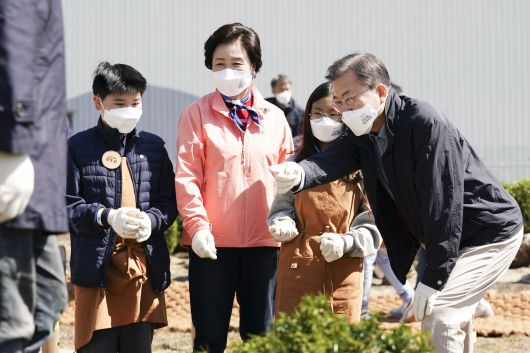 문재인 대통령과 김정숙 여사가 5일 마포구 서울복합화력발전소에서 열린 제76회 식목일 기념행사에서 상지초등학교 어린이들과 나무를 심고 있다. /연합뉴스 |