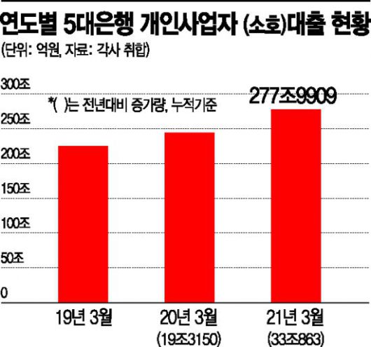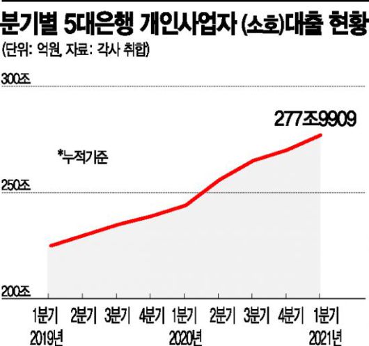 5일 금융권에 따르면 지난달 기준 KB국민·신한·하나·우리·NH농협 등 5대 은행의 개인사업자(소호) 대출은 277조9909억원(누적)으로 지난해 말 270조8672억원보다 7조1236억원 증가했다. 전년 동기 244조9046억원에 비해서는 33조863억원(13.50%)이나 늘어났다. 이는 코로나19 발생 전인 2019년 3월(225조5896억원) 기준 순증액 19조3150원에 비해서는 13조7713억원(23.22%)이 증가한 수치다. 코로나19에 따른 매출 충격 등으로 빚더미에 오른 자영업자들이 그만큼 늘어났다는 의미로 해석된다.