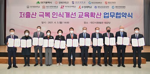 (대구=연합뉴스) 대구시와 지역 10개 대학은 5일 오후 시청 별관 대강당에서 저출산 극복 인식개선 교육 확산을 위한 업무협약을 했다. 참여 기관들은 청년을 상대로 결혼과 출산에 대한 긍정적 가치관을 함양하기 위해 '대학생 결혼·육아 U-러닝 콘텐츠' 확산을 위해 상호 협력하기로 했다.
