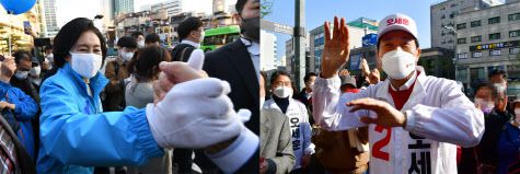 더불어민주당 박영선 서울시장 후보와 국민의힘 오세훈 서울시장 후보가 5일 서울 관악구 신림역 사거리와 강서구 등촌역 인근에서 시민들과 인사하고 있다. (사진=연합뉴스) |