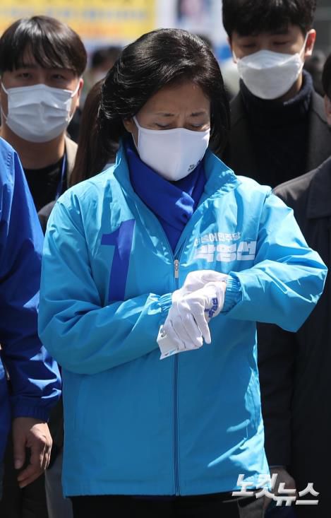 국회사진취재단 박영선 더불어민주당 서울시장 후보가 6일 서울 종로구 동화면세점 앞에서 열린 광화문 집중유세에 참석하며 시계를 바라보고 있다.저작권자 © CBS 노컷뉴스 무단전재 및 재배포 금지