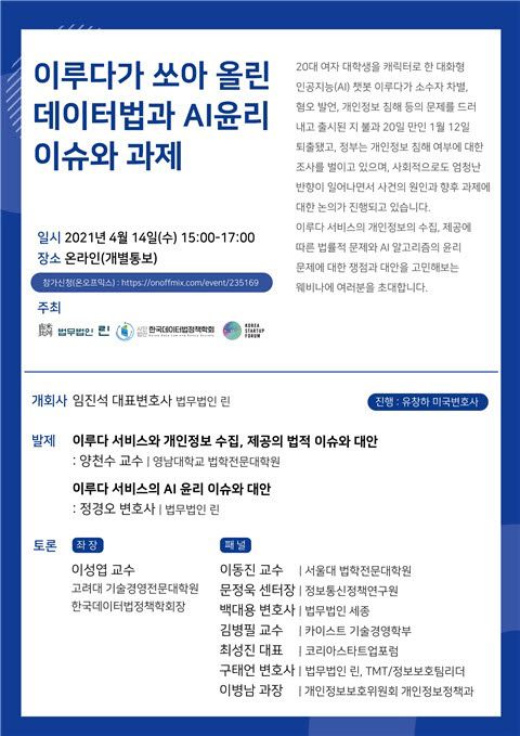 한국데이터법정책학회, 코리아스타트업포럼, 법무법인 린이 공동 개최하는 이번 행사는 이루다가 제기한 AI 개인정보 수집·제공에 따른 법률적 문제와 AI 알고리즘 윤리 쟁점, 대안을 공유한다.