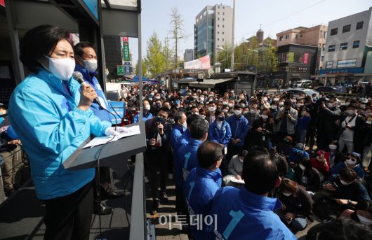 박영선 더불어민주당 오세훈 국민의힘 서울시장 후보가 6일 유세하고 있다.(신태현 기자) |