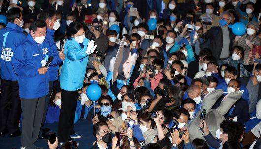 더불어민주당 박영선 서울시장 후보가 6일 서울 마포구 홍익대 인근 상상마당 앞 유세에서 지지자들을 향해 인사하고 있다. 박 후보는 “오늘은 시시각각 유세 현장 갈 때마다 바람의 속도가 바뀌고 있다”며 “내일 투표하면 승리한다”고 했다. /국회사진기자단 |