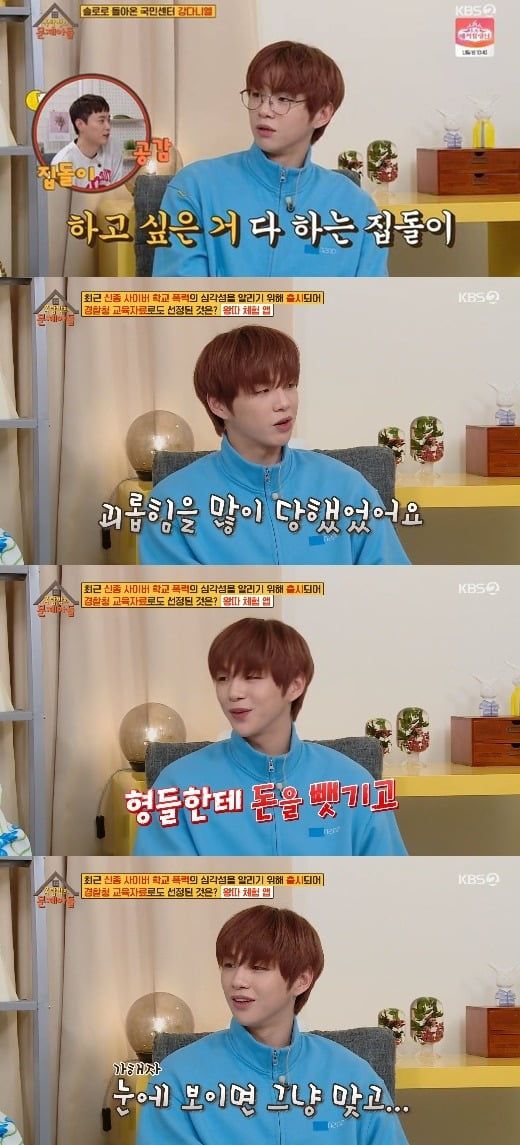 가해자들이 제일 심하게 한 행동이 뭐냐고 묻자 강다니엘은 “초등학교 4~5학년쯤인데, 형들한테 돈을 뺏기고 눈에 걸리면 맞았다”며 “가해자들에게는 그냥 놀이었던 것 같다”고 회상했다.