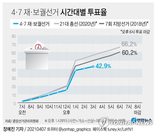 (과천=연합뉴스) 전명훈 기자 = 중앙선거관리위원회는 7일 서울·부산시장을 포함해 전국 21곳에서 진행 중인 재보궐 선거 투표율이 오후 3시 현재 42.9%라고 밝혔다.