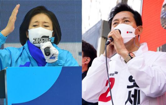 4·7 보궐선거를 하루 앞둔 지난 6일 박영선 더불어민주당 서울시장 후보(왼쪽)와 오세훈 국민의힘 서울시장 후보가 각각 서울 종로구 동화면세점 앞과 노원구 상계백병원 앞 사거리에서 유세를 하며 지지를 호소하고 있다. 뉴스1 |