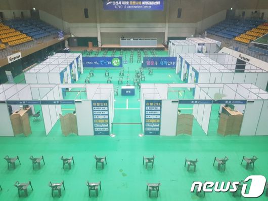 안산올림픽기념관 체육관에 설치된 안산시 제1호 코로나19 예방접종센터. © 뉴스1 |