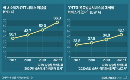 관련 업체들이 너나 할 것 없이 투자 행렬에 나선 것은 글로벌 기업의 무차별 공습 때문이다. 무엇보다 넷플릭스의 국내 시장점유율이 지난해 절반 이상을 넘으면서 관련 업계의 위기감을 고조, 투자 경쟁을 촉발시켰다.